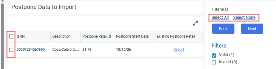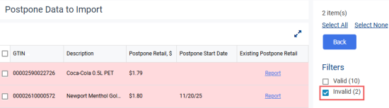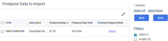 Hover the Report link in the Existing Postpone Retail column to see import errors. Click the link to navigate to the Postpone Retail Change report, which will be automatically filtered by the selected location and item.