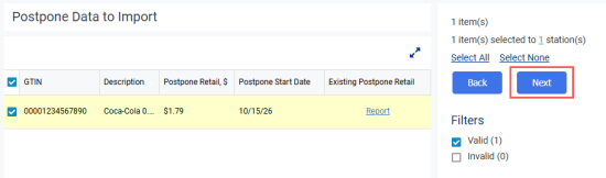 - Click Verify Information to navigate to the Postpone Retail Change report filtered by the target stations, or click Close to return to the bulk import interface.