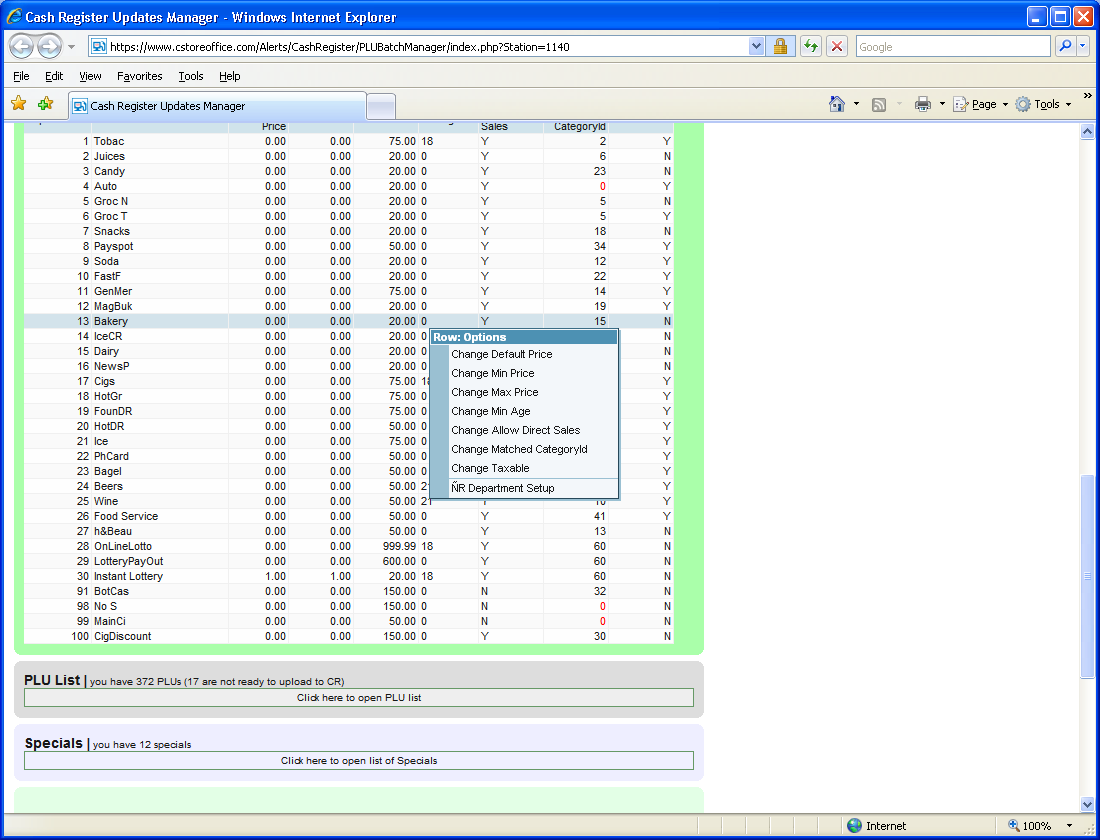 If you right click an item, it will bring up a menu that displays the options available to you in the update manager. You can change the retail, cash register department, CR Name, Category and also assign the item to an existing Price Group or Promo Group.