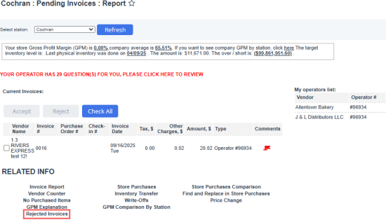 - Deleted by user - CStoreOffice® user who rejected the invoice.