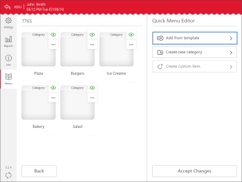 New! It is now possible to add categories and items from the Ethalon account menu. Where: QwickServe Device> administrative interface > Menus view > Menu > Add from template. UI Changes: In the Quick Menu Editor, the Add from template option is now available. For details, see Working with Menus at QwickServe Devices. |
