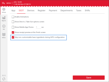 Improved! It is now possible to control whether base ingredients must be shown to a customer if the item recipe contains no optional ingredients. Where: SSOT > administrative interface > Settings view > SSOT tab. UI Changes: The Skip non-customizable base ingredients during MTO configuration option has been added to the SSOT view. For details, see QwickServe SSOT Settings. |