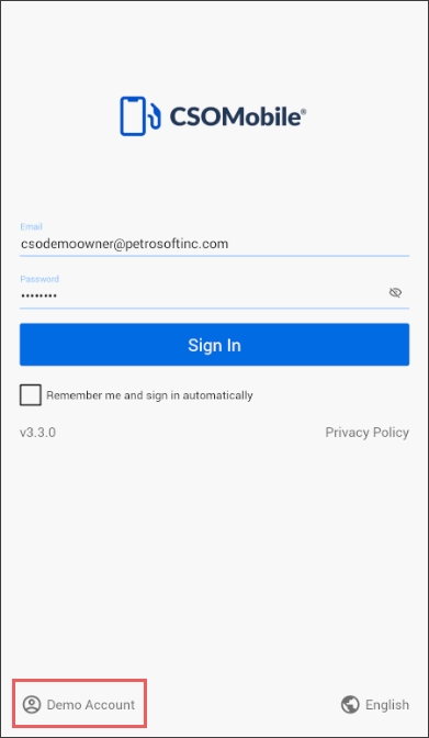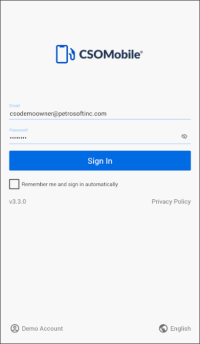 If you want to evaluate CStoreOffice® Mobile App capabilities, you can log in to the application using the demo account. To do this, at the bottom left corner of the logon view, tap Demo Account.