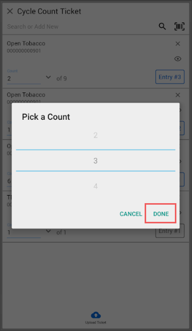- In the Count field, specify the number of counted items. You can type the number directly or tap the arrow icon to the right and scroll up or down in the Pick a Count window.