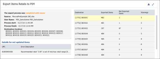 - Warnings: The number of items exported with warnings. The items with warnings are exported, but do not trigger any updates in PIM.