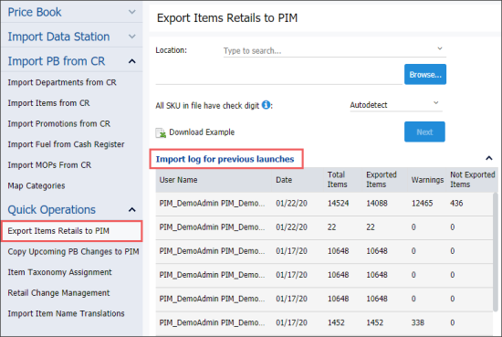 - In the Export Items Retails to PIM form, click Import log for previous launches.