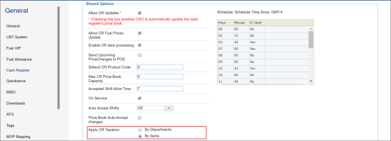 The settings in the Apply CR Taxation section are supported only by the Radiant cash registers.