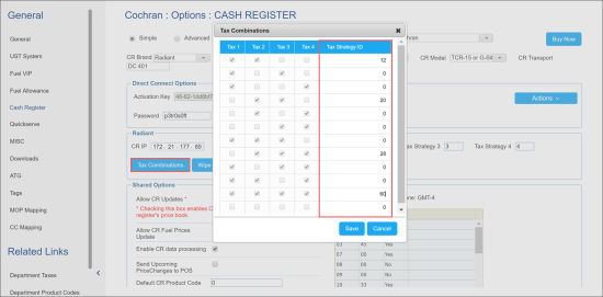 - In the Cash Register form, in the section with the cash register name, click Tax Combinations.