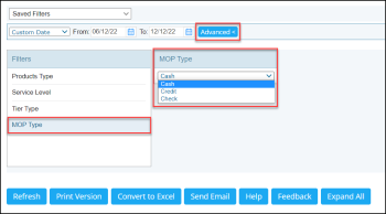- MOP Type: Select the mode of payment. By default, the Cash option is selected and applied to the report.