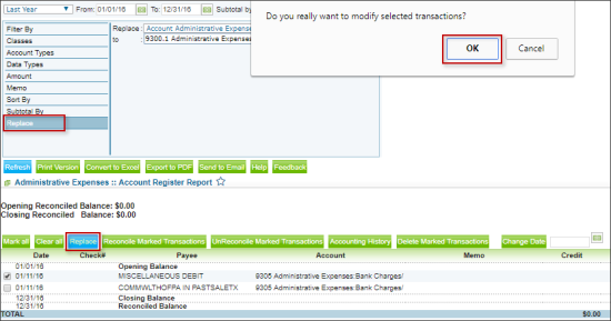 To reconcile a transaction, select it, click Reconcile Marked Transactions and then in the confirmation window, click OK.
