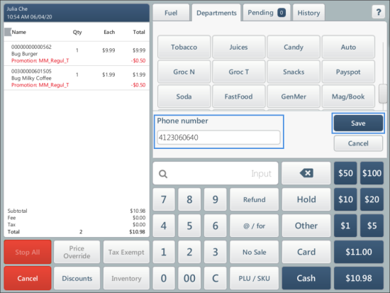 Result: The Phone number form is displayed in the cashier screen. - Ask the customer's phone number, type it into the Phone number form and press Save.