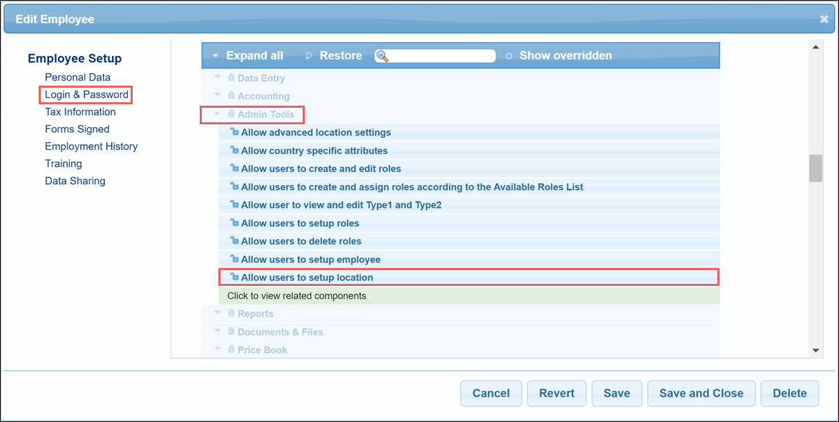 - Expand the Admin Tools section and make sure that the Allow user to setup locations is granted to the user.