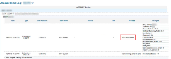 In case the CR Parser routine is displayed in the Process column of the Items Log report, it indicates that the item has been added to the system during shifts parsing and might not have all mandatory price book settings configured.