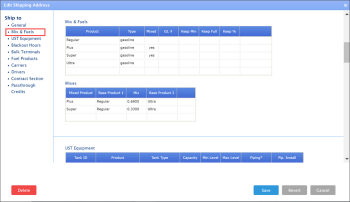 - In the Mix & Fuels section, make sure the fuel products and mixes values are displayed correctly. If necessary, go to Station Setup > UST System > Mix & Fuels. For details, see Setting up Products and Mixes.