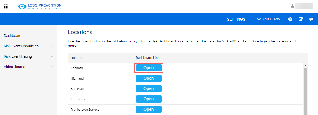 - In the list of locations, click Open next to the location whose LPA settings console you want to open.