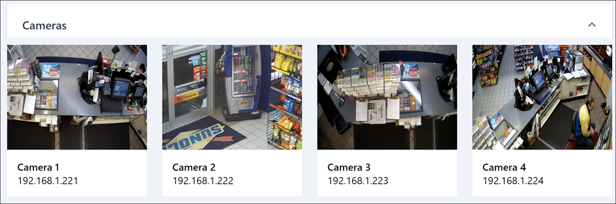 In the Cameras widget, you can watch videos from cameras set up at the location. The list of cameras from which videos are demonstrated can be configured in the Camera Settings section. For details, see Changing Video Streams in Camera Slots.