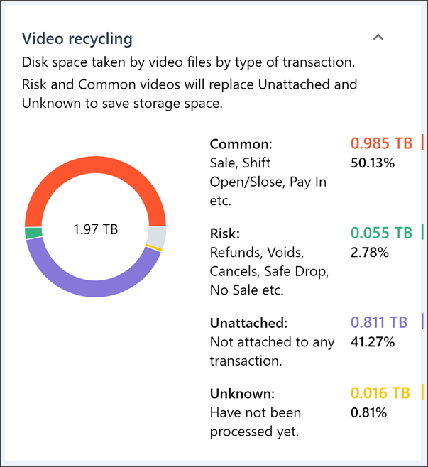 In the Video recycling widget, you can view how much space is taken by video files of different transaction types on the NAS storage. The widget presents a pie chart visualizing the storage space data and metrics by categories.