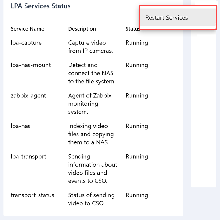 If necessary, you can restart LPA services from the settings console. To do this, at the top right of the widget, click the three dots icon and select Restart Services.