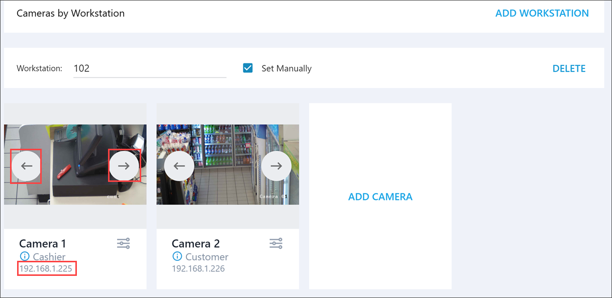 If there are more than 4 cameras at the location, or if the cameras are assigned incorrectly (for example, the customer-facing camera is set as the cashier desk camera), you can reassign the correct camera to each slot as needed. Click the left and right arrow buttons overlaying the video slot to switch its video source to a different camera. Refer to the IP address displayed below the video to identify the camera currently streaming in the slot.