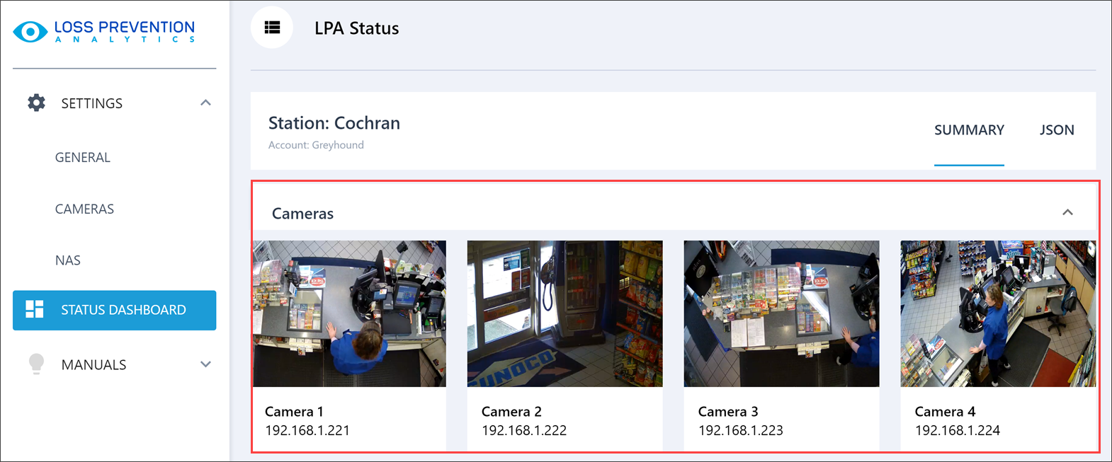 When you access the location's Cameras section for the first time, Loss Prevention Analytics automatically creates the workstation. The system discovers all compatible cameras in the local network and automatically populates the workstation's camera slots with videos from the first 4 cameras (based on their IP addresses). This default configuration is remembered for the future and is used for the Loss Prevention Analytics Video Journal and the Settings Console.