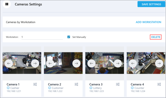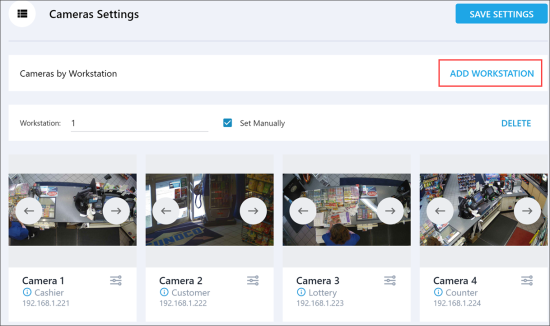 You can add and delete cameras from workstations in the settings console. A maximum of 4 cameras can be added to the workstation pointing to different areas at the location: