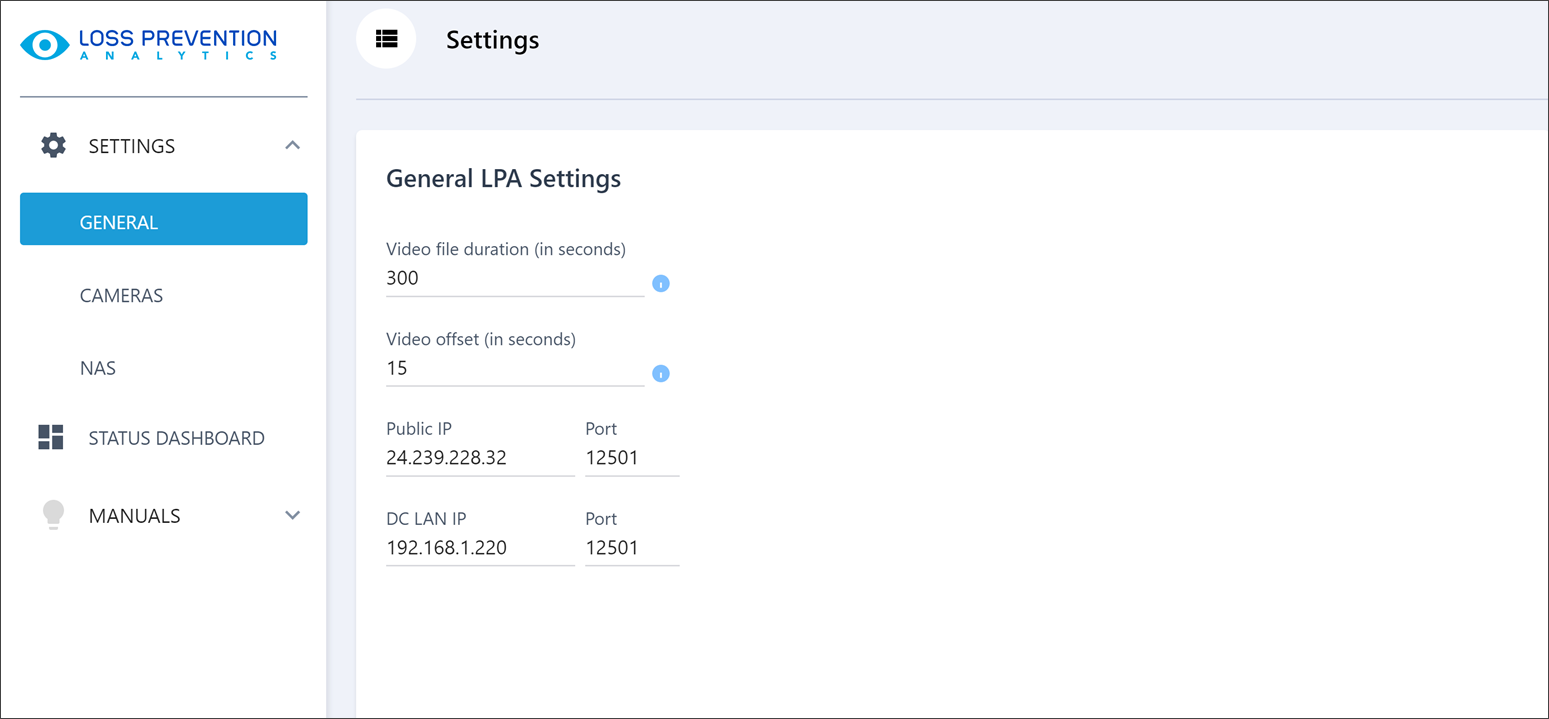 - Video file duration: Specify the duration of video files created by LPA (in seconds). The recommended video duration is 300 seconds.
