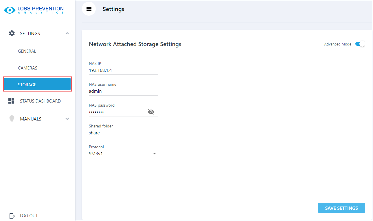 The Storage section provides access to both general and advanced NAS device settings. To view all settings, including advanced ones, at the top right of the section, set the Advanced toggle to the On position.