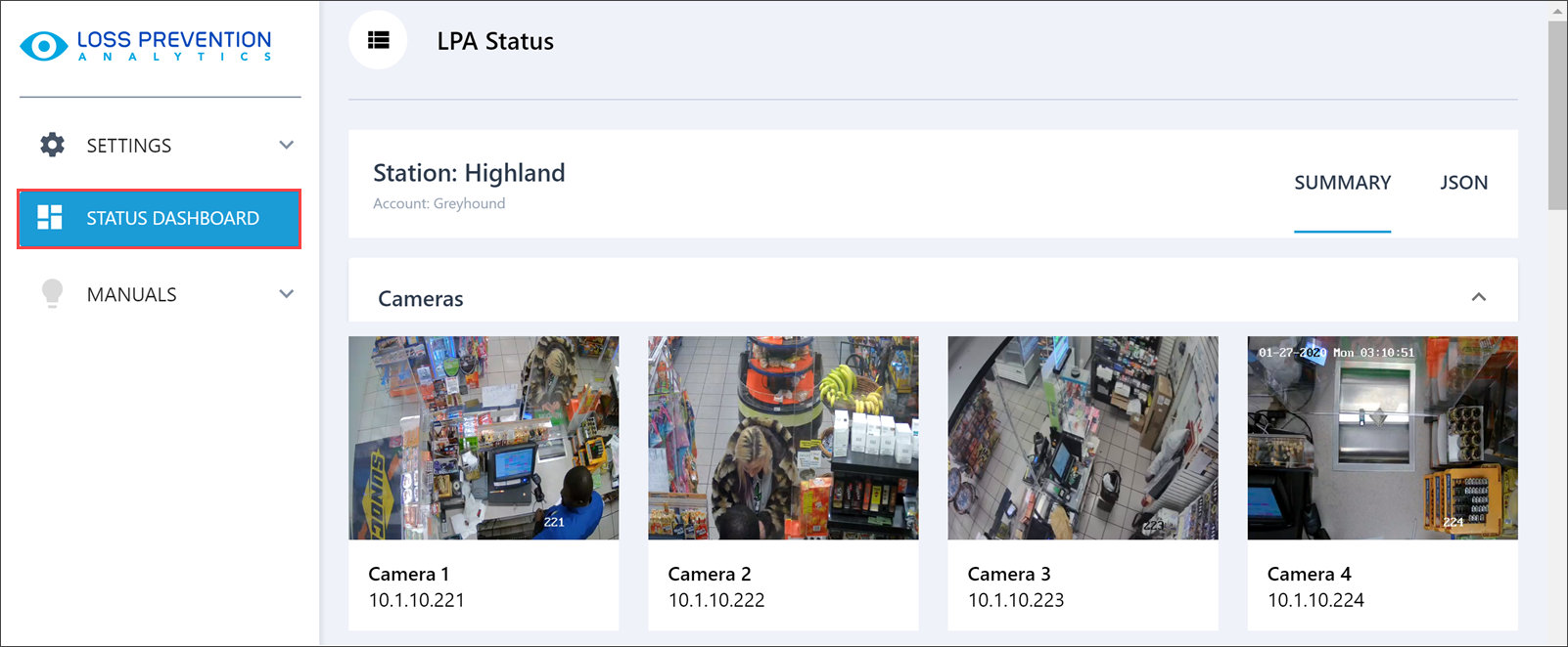 - Go to the LPA dashboard > Status Dashboard > Summary and make sure video streams from the cameras are available in the Cameras section.