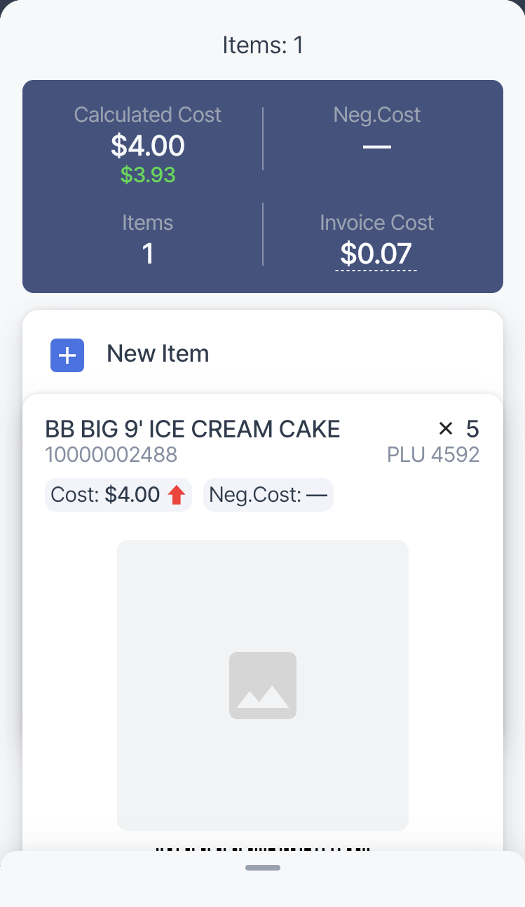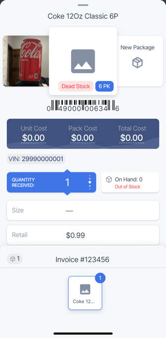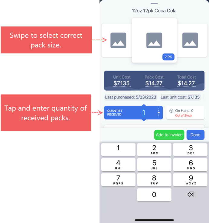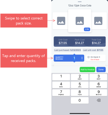 - Enter cost for the package, quantity of received packs or cases in the QUANTITY RECEIVED selector and tap Update Invoice.
