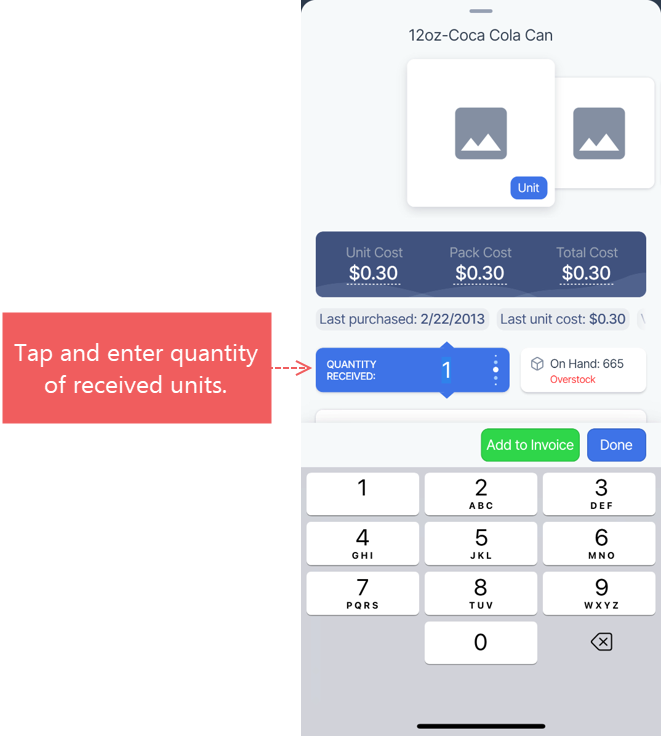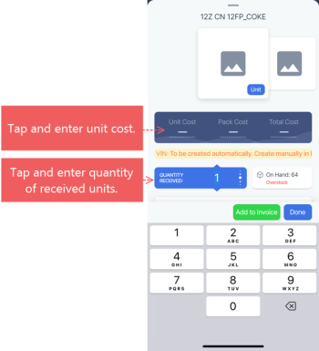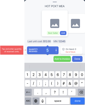 - Tap the QUANTITY RECEIVED selector and enter the quantity of units you received, then tap Add to Invoice. After that, go to step 7 to add another item to the invoice or step 10 to finish adding items to the invoice.