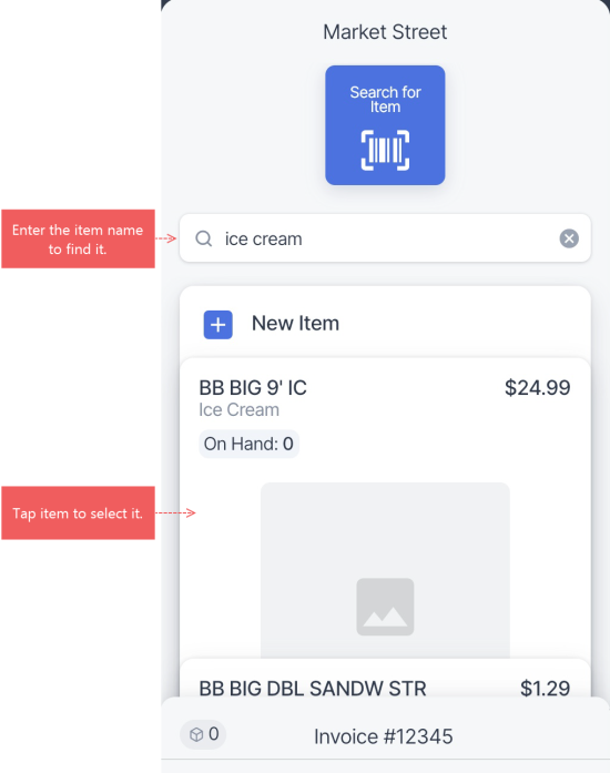 - To add the item manually, enter the item name in the search box and tap the found item in the items list. Then, go to step 8 of this procedure.