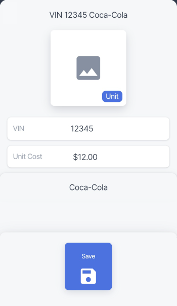 - Enter VIN in the VIN field and the unit cost in the Unit Cost field and swipe up to save the cost and VIN relationship.