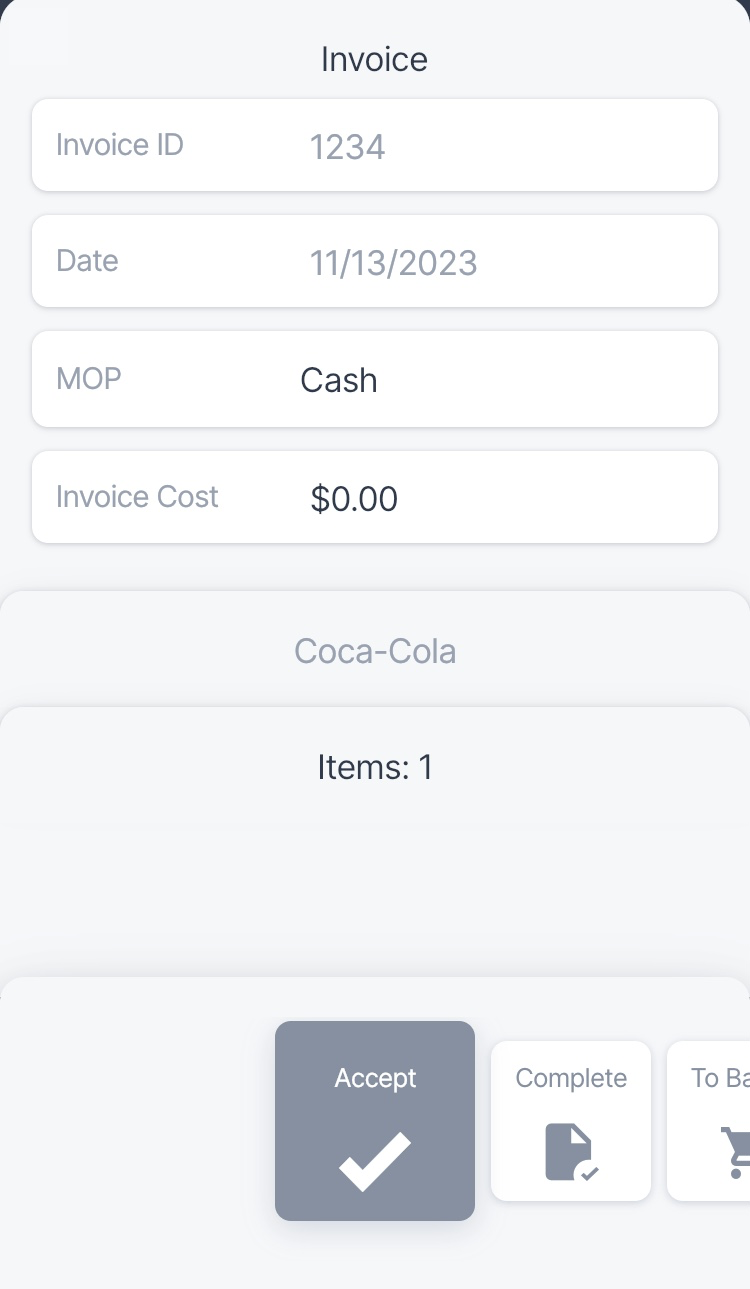 - To complete this invoice, swipe the lower curtain up, select the Complete tile and swipe up. After completing the invoice, you can accept it. For details, see Accepting a pending invoice.