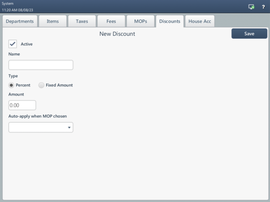 To create a new discount, on the Discounts tab, press the add button, enter the following information, and then press Save: